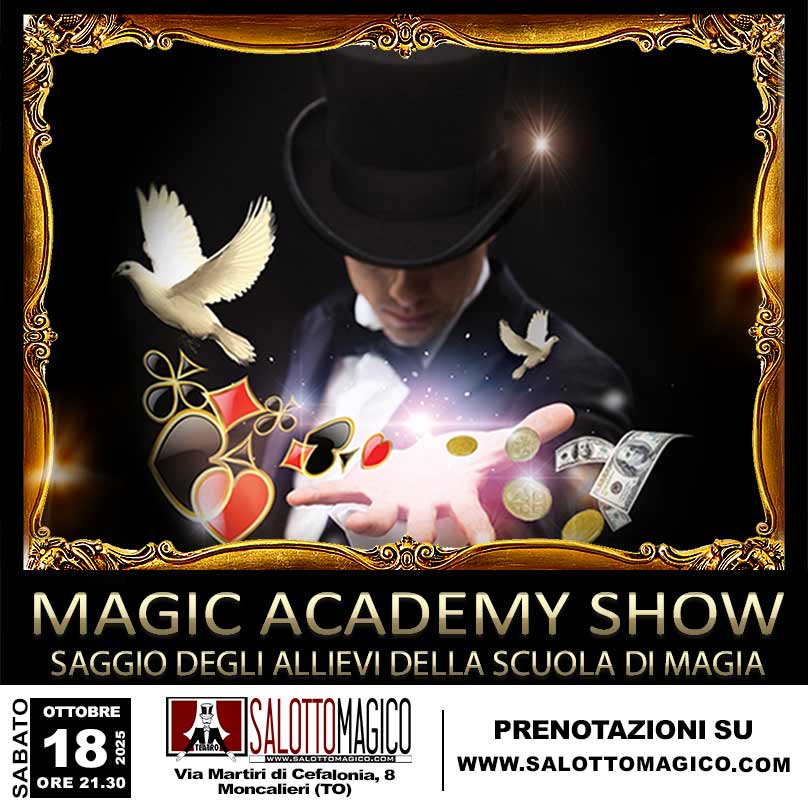 Gli allievi della Torino Magic Academy, si esibiranno in un saggio di fine anno , mettendo in pratica quanto imparato durante il corso, dando vita ad uno spettacolo di magia.